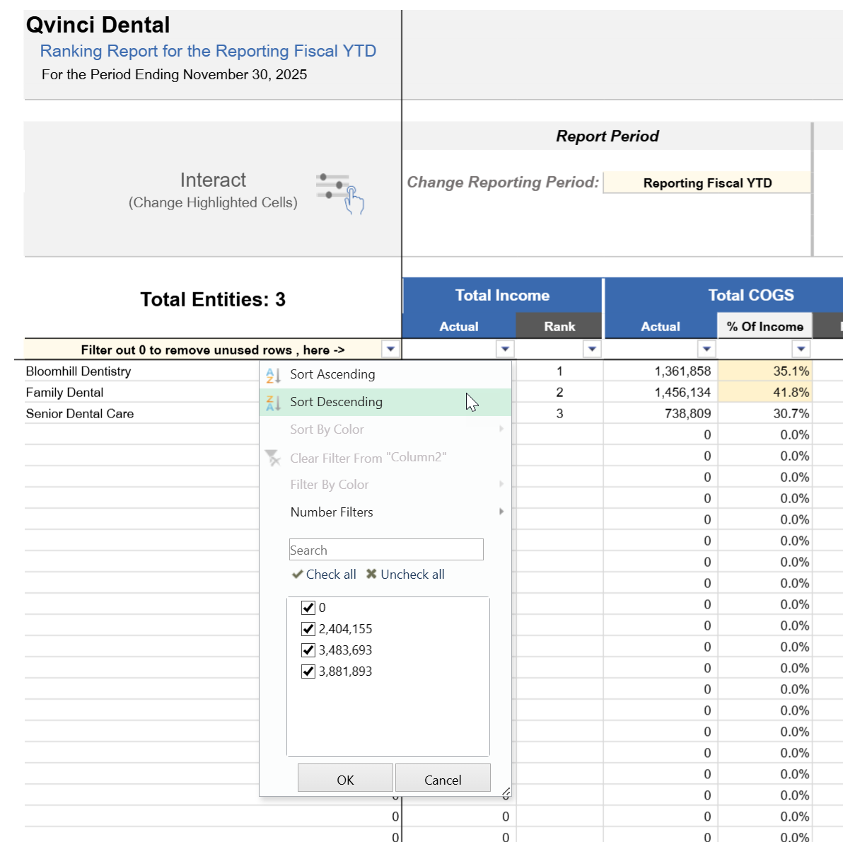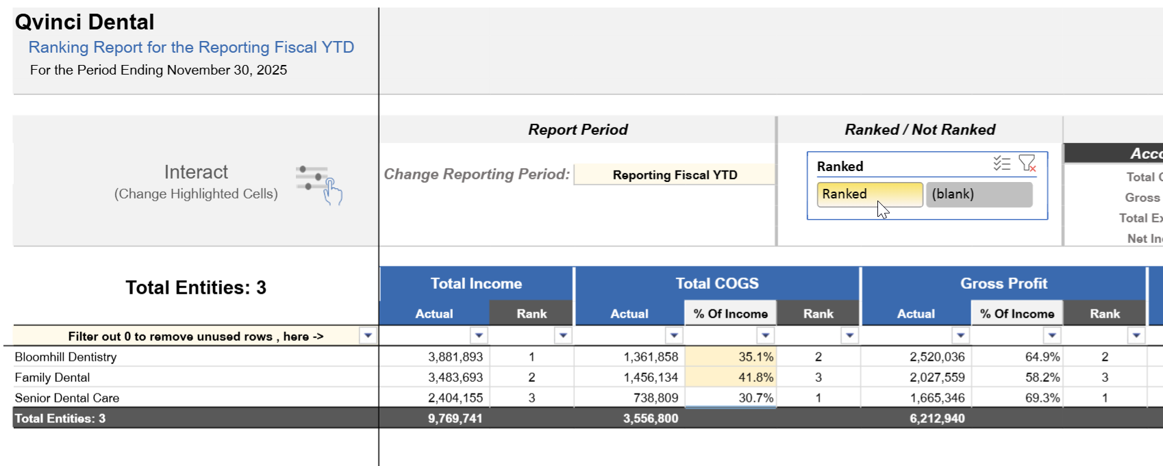 These Ranking by Entity reports allow you to analyze financial performance across up to 300 entities in a consolidated, table-based view. Each entity appears as a row, with key financial metrics displayed as columns—making it easy to compare results and identify trends at a glance.