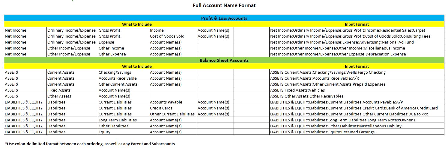 When a user needs to list out account names in a report template and duplicates exist, a resolution can be found by entering the full account name string in the chart of accounts column (Column A). The format shown below must be precise, even case sensitive, but if all account names are entered in the following format this will make the financial data bind against the full account name, based upon the account name path.