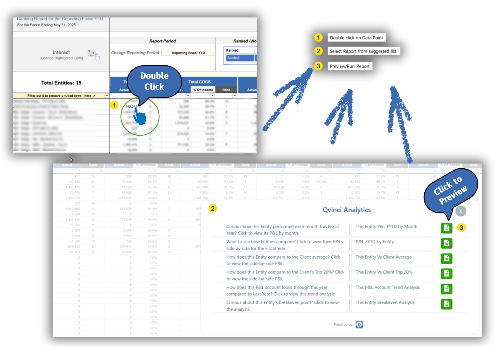 Discover what the numbers really mean. Double-click a data point to drill down and uncover the story behind it. Qvinci suggests the right follow-up reports, each with further drill down capability, so you can follow the data trail, spot trends, and answer critical financial questions in real time.